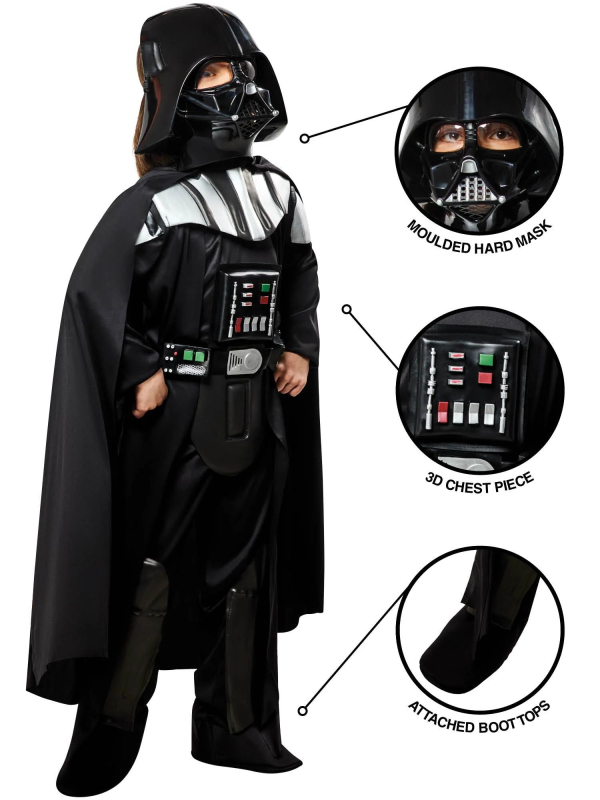 Kostým s plastovým pancířem, pláštěm, návleky na boty a maskou. Meč a rukavice nejsou součástí kostýmu. Vel. M/L - délka od ramen 103/120, rukáv 44/52, délka nohavice od rozkroku 53/61 cm.Darth Vader, vrcholný padouch původní trilogie, se narodil jako Anakin Skywalker, Jedi, kterého Palpatine zlákal na temnou stranu. Tento ikonický antihrdina filmů Lucase a Disneyho ze série Star Wars, Darth, je otcem Luka a Leiy a vyznačuje se černým róbou, pláštěm, helmou a dýchacím přístrojem. Staňte se ještě dnes vládnoucím Sithským pánem Galaktického impéria - a ať je s vámi síla. Součástí je overal z polyesteru s připojeným počítačovým ovládacím panelem s potiskem, límec z EVA s potiskem, rukávy po celé délce a připevněné 3D návleky na boty s chrániči holení a všitým dílem na ochranu zad 3D opasek s malovanými detaily a zapínáním vzadu Dlouhý plášť z polyesteru s řetízkem, zapínáním u krku Tvarovaná maska ??s průhlednými kryty očí a elastickým páskem se zapínáním na háček a očka. Světelný meč a rukavice nejsou součástí balení Toto je oficiálně licencovaný produkt Star Wars. Zobrazit více