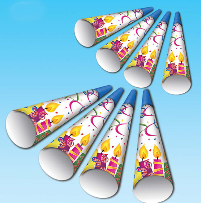 Papírové trumpety s motivem oslavy narozenin. 8ks v balení. Zobrazit více