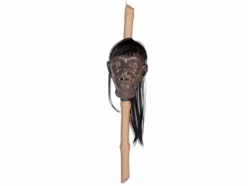 Useknutá hlava s vlasy na bambusové tyčce